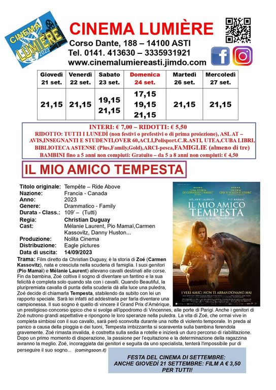 Per informazioni:: 0141.413630 e 333.5931.921- SITO: www.cinemalumiereasti.jimdofree.com - pagina FB: Lumière e INSTAGRAM: lumiereasti.