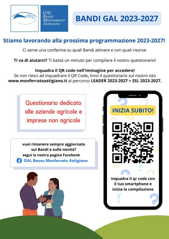 In occasione della preparazione della prossima programmazione 2023-2027, il Gal Basso Monferrato Astigiano propone un sondaggio rivolto alle aziende agricole che intendono diversificare l’attività agricola in altre direzioni complementari, ed alle imprese non agricole operanti nel settore turistico (ad es. casa vacanze...) o in un settore che può essere collegato al turismo (ad es. commercio di prodotti tipici locali, artigianato di qualità ecc.) con l’obiettivo di ampliare il target di clientela, anche in considerazione del sempre maggiore successo del brand del Monferrato.