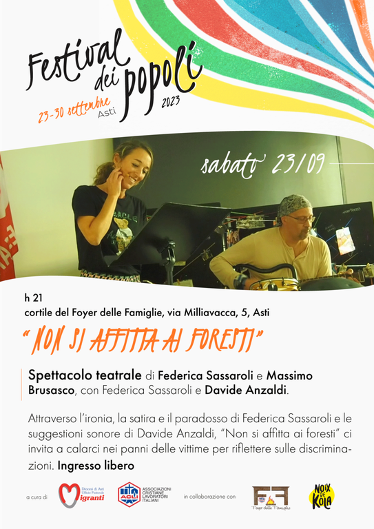 La sera, alle ore 21, presso il Foyer delle Famiglie di via Milliavacca 5, l’attrice Federica Sassaroli e il polistrumentista Davide Anzaldi porteranno in scena lo spettacolo teatrale “Non si affitta ai foresti” di Federica Sassaroli e Massimo Brusasco, un invito a calarci nei panni delle vittime per riflettere sulle discriminazioni. Ingresso libero.