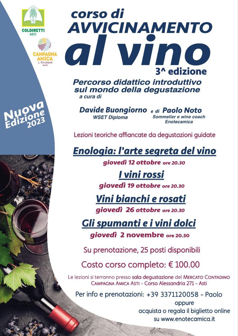 Da giovedì 12 ottobre, partirà la terza edizione del corso di avvicinamento al vino, il percorso didattico introduttivo sul mondo della degustazione a cura di Davide Buongiorno (Wset Diploma) e di Paolo Noto (sommelier e wine coach dell’EnotecAmica).