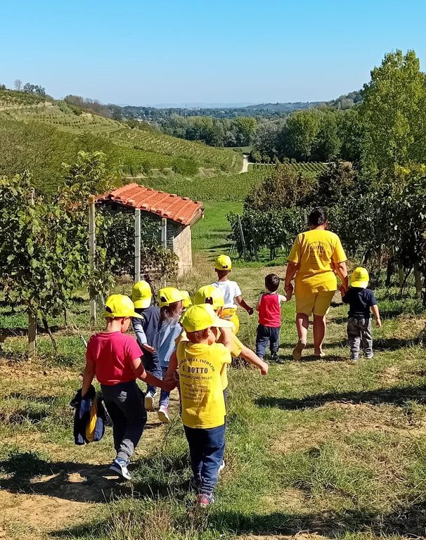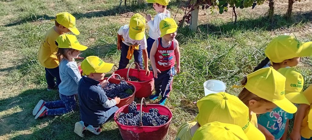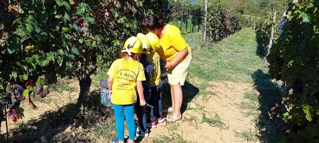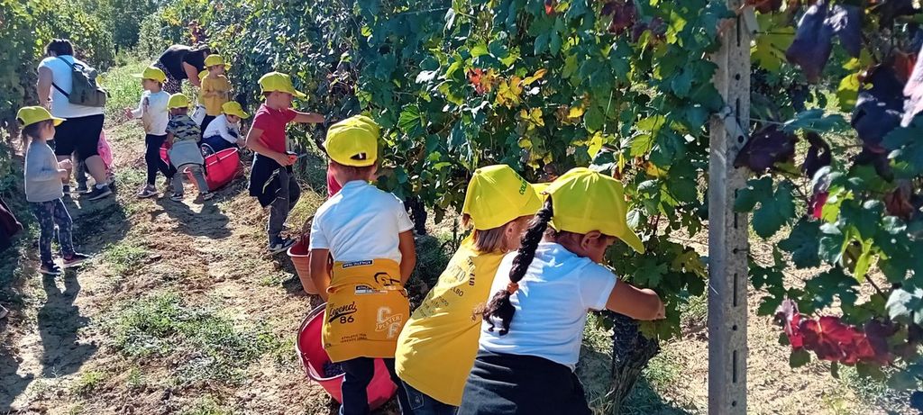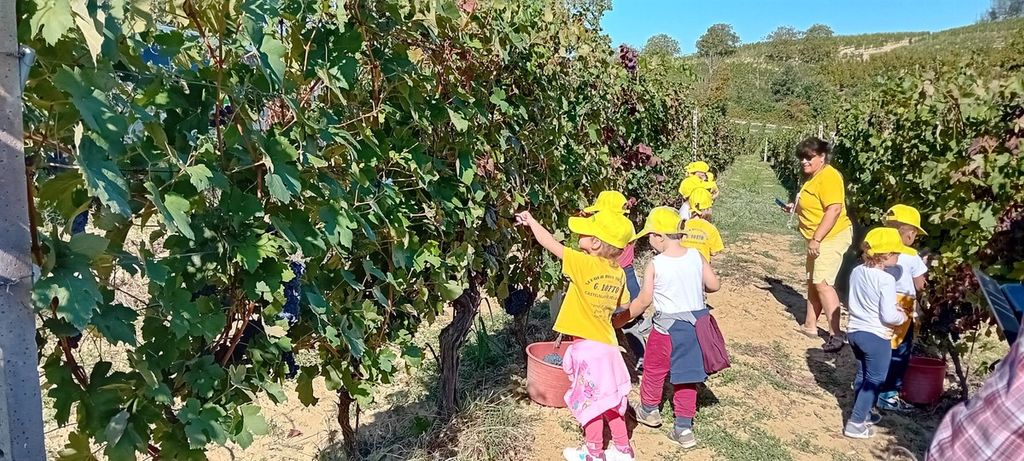 Sotto l'esperta guida delle loro insegnanti, i bambini hanno avuto l'opportunità di sperimentare una vera e propria vendemmia in un filare presso l'azienda agricola di Caligaris Gian Mario nella regione di Borghi. Hanno potuto toccare con mano le uve mature e imparare l'importanza della loro raccolta. Poi, sono stati invitati a versare alcune uve in una cesta quadrata, dove i bambini hanno potuto godere delle sensazioni uniche di pigiare l'uva con i piedi, proprio come si faceva in passato.