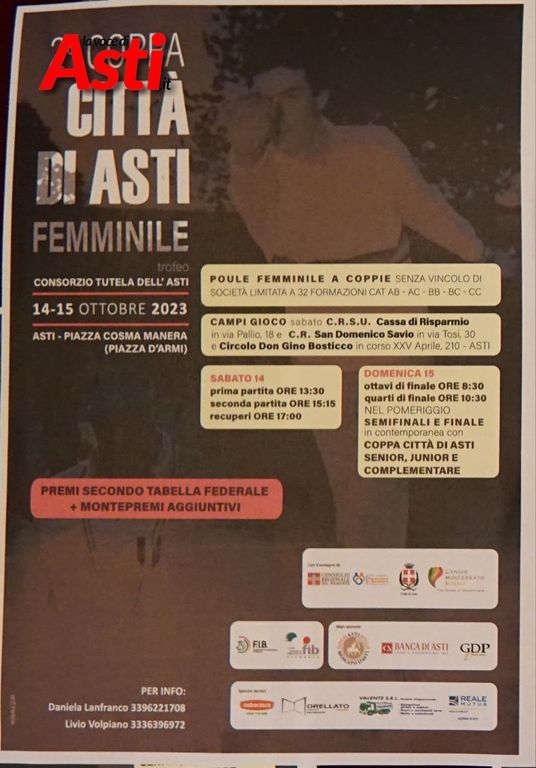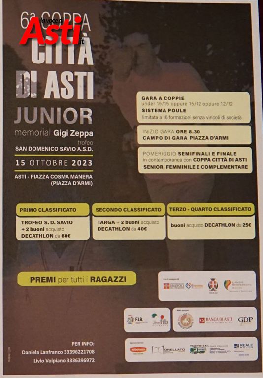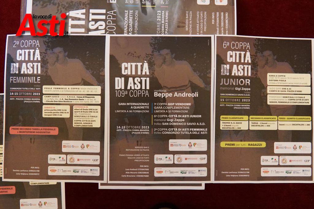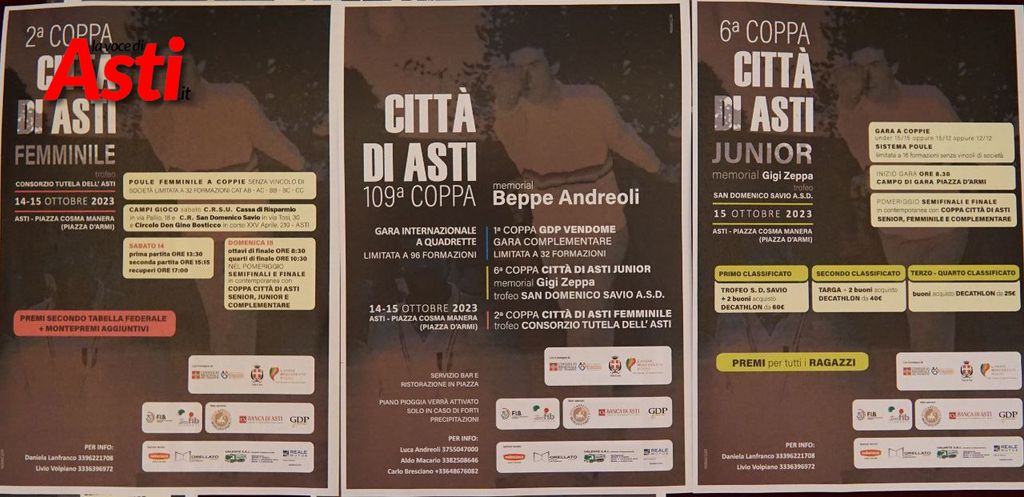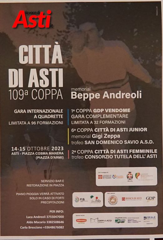 Il 14 e il 15 ottobre Asti diventerà il punto di riferimento nazionale ed europeo delle bocce. La coppa Città di Asti memorial "Beppe Andreoli", giunta quest'anno alla 109 edizione, infatti, porterà nella nostra città quadrette da tutte le regioni d'Italia, oltre che dalla Francia e altri paesi europei.