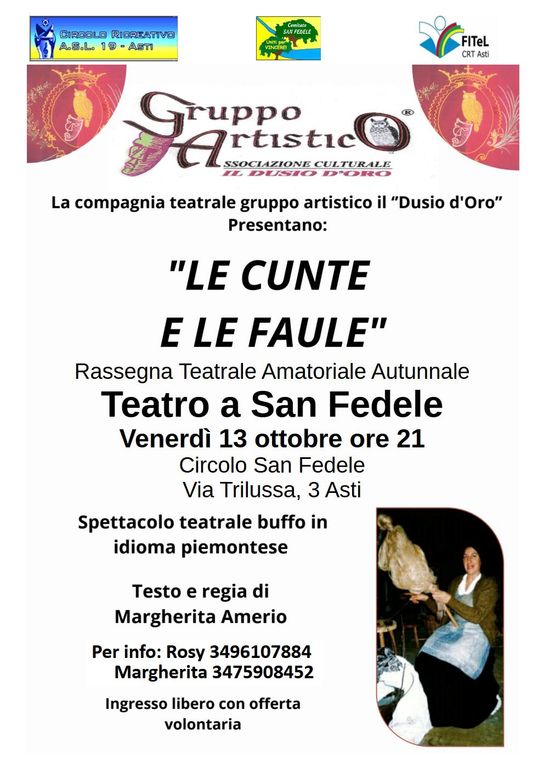 Il primo appuntamento vedrà protagonista il Gruppo Artistico il "Dusio d'Oro", che presenterà "Le Cunte e le Faule", spettacolo teatrale buffo in idioma piemontese con testo e regia di Margherita Amerio.