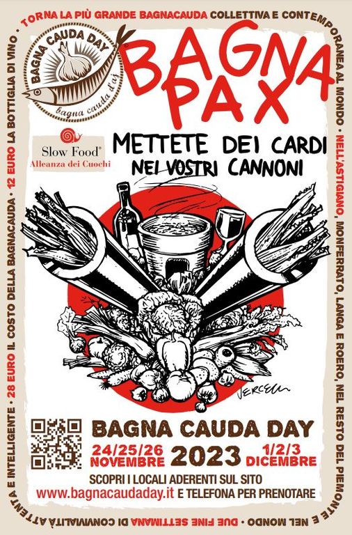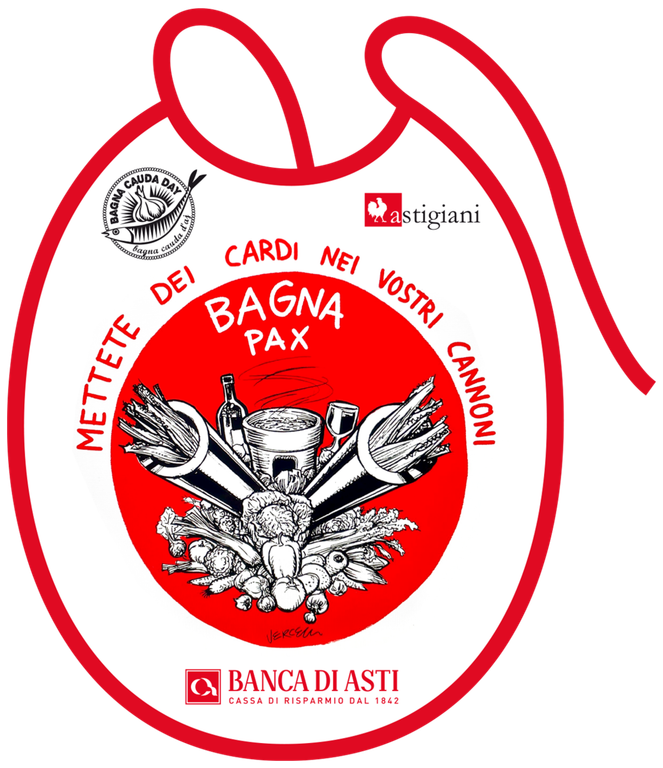 "Il Bagna Cauda Day di quest’anno lancia un messaggio importante divenuto purtroppo ancor più di attualità. Abbiamo affidato a Gino Vercelli, fumettista di vaglia, il compito di disegnare lo slogan “Bagna Pax: mettete dei cardi nei vostri cannoni”. Un forte richiamo alla voglia di pace e di convivialità che già l’anno scorso con la Caritas ci aveva fatto organizzare una bagna cauda con ospiti ucraini e russi - raccontano da Astigiani - Tutti i bagnacaudisti che nell’ultimo fine settimana di novembre e nel primo week end di dicembre andranno a gustare la bagna cauda nei locali aderenti riceveranno in omaggio il bavagliolone in stoffa"