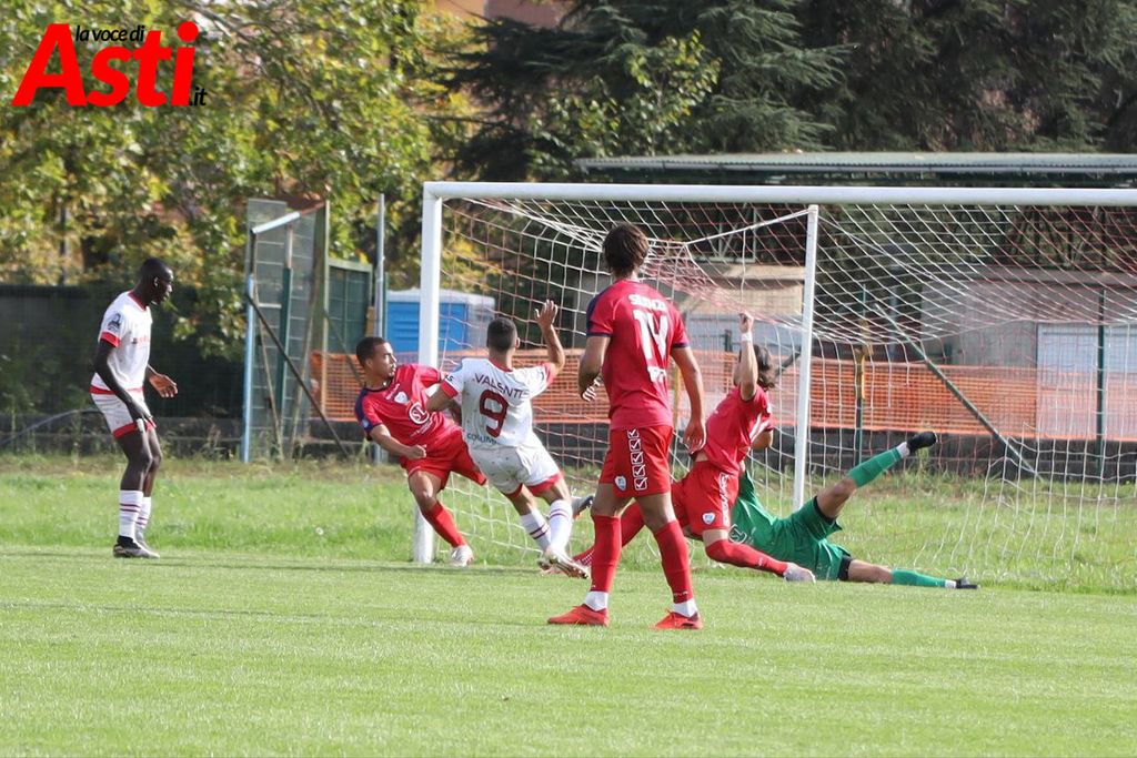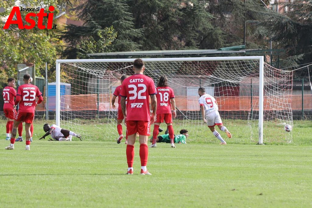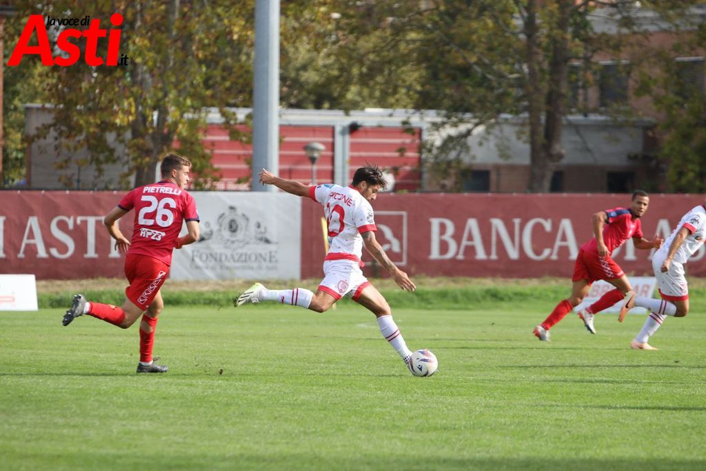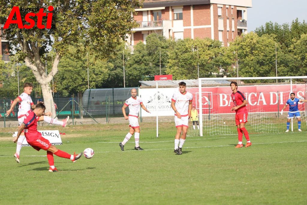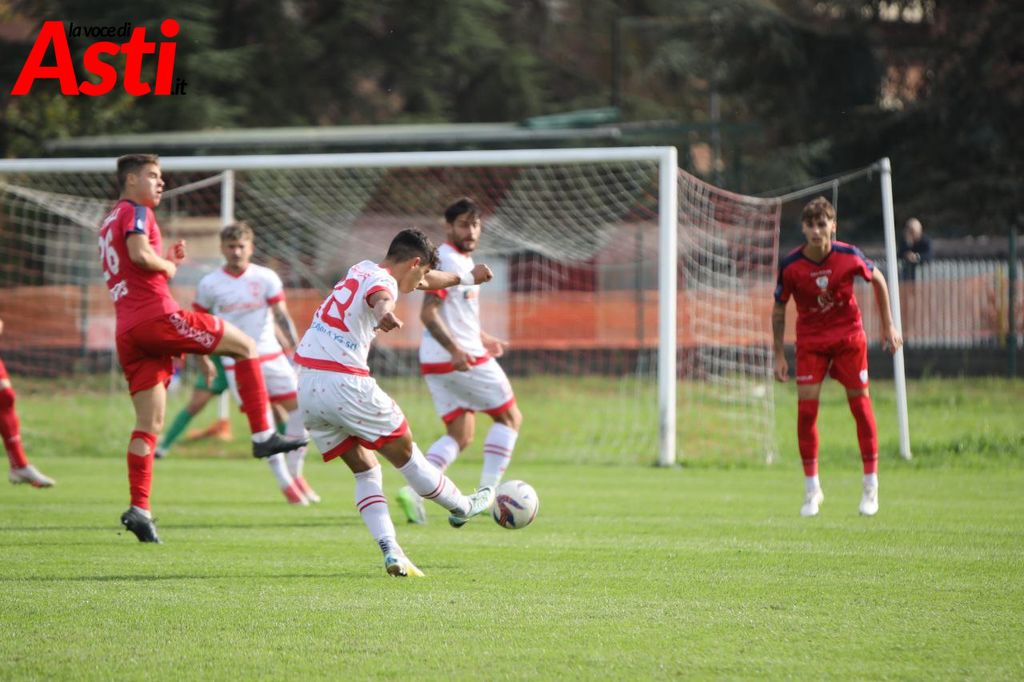 I biancorossi si regalano una prestazione maiuscola chiudendo già il match nei primi 45 minuti di gioco. I galletti la sbloccano subito al minuto 11, quando Soumahoro supera Bohli. Raddoppio al 15' con Valenti, mentre il tris dell'Asti arriva con l'ex Giacchino al 35'.
