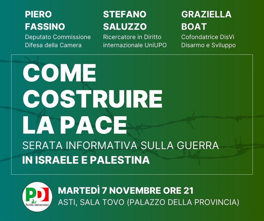 All’incontro, organizzato dal Partito Democratico, parteciperanno l’On. Piero Fassino (membro della Commissione Difesa della Camera dei deputati), Stefano Saluzzo (ricercatore in Diritti internazionale presso l’Università del Piemonte Orientale) e Graziella Boat (cofondatrice DisVi -Disarmo e Sviluppo)
