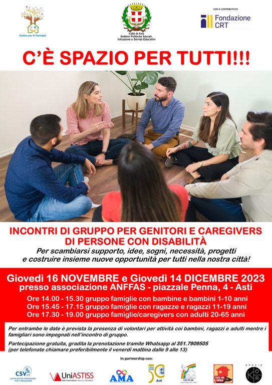 Partners (CSV Asti Alessandria, Anffas, Ama, Cepim, Casa del Popolo, Associazione Craft Spazio Kor, Astiss) e realtà che nel percorso vorranno partecipare, a coprogettare , a partire da quanto emergerà dalle famiglie percorsi di inclusione sociale, tempo libero e opportunità per tutti.