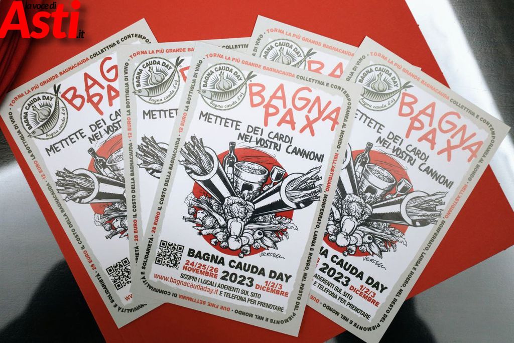 “Il Bagna Cauda Day di quest’anno lancia un messaggio importante divenuto purtroppo ancor più di attualità– rimarca l’associazione con Sergio Miravalle-Abbiamo affidato al fumettista Gino Vercelli, il compito di disegnare lo slogan“ Bagna Pax: mettete dei cardi nei vostri cannoni”.
