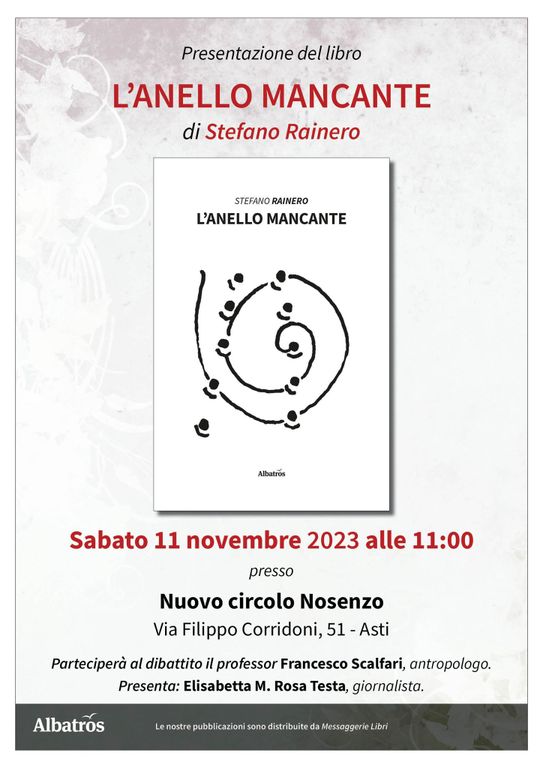Sabato 11 novembre alle 11 al Nuovo Circolo Nosenzo di Asti (via Corridoni 51), sarà presentato il libro "L'anello mancante" (Gruppo Albatros Il Filo) dell'astigiano Stefano Rainero.