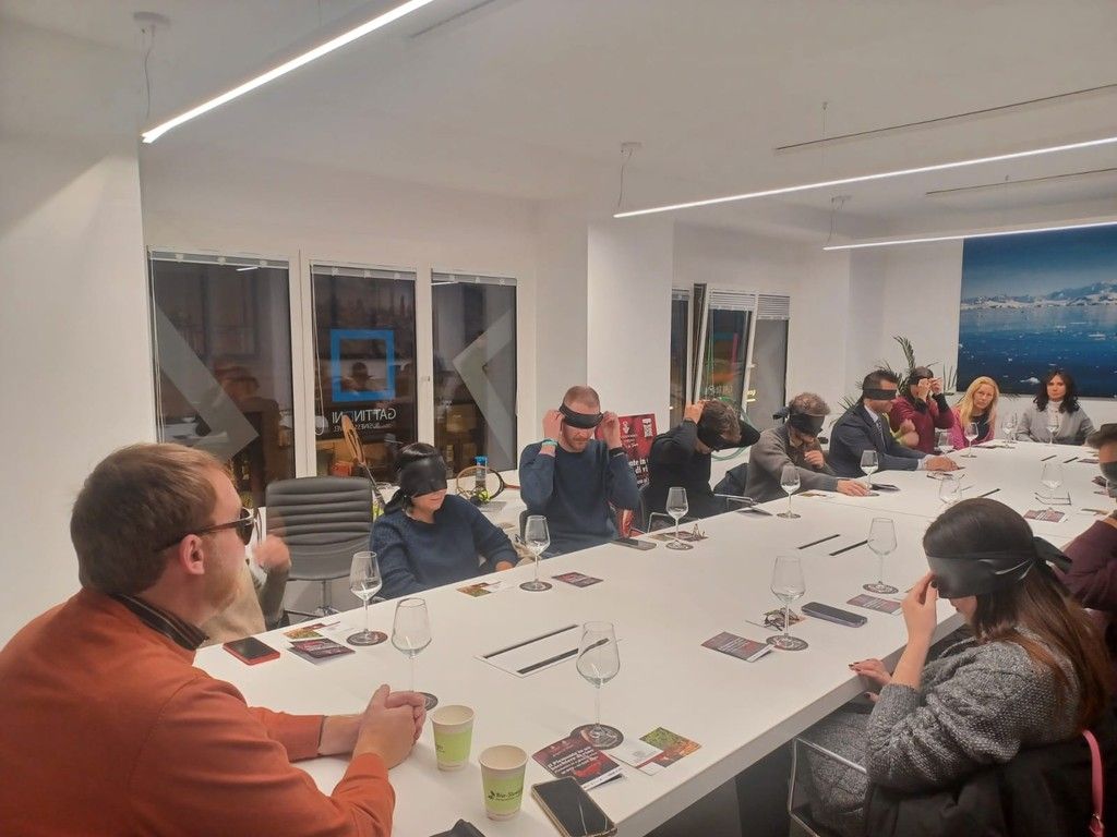 I degustatori nel corso dell'evento sono stati bendati per non essere ingannati dal colore del vino o dall'aspetto del bicchiere in cui è stato servito . Assaggiare i vini alla "cieca" è stato il fil rouge che ha collegato l'evento. Non avendo la vista il pubblico è stato invitato a seguire tutti gli altri sensi, come l'olfatto per riconoscere l'odore del vino, o l'udito e il tatto per capirne la qualità.
