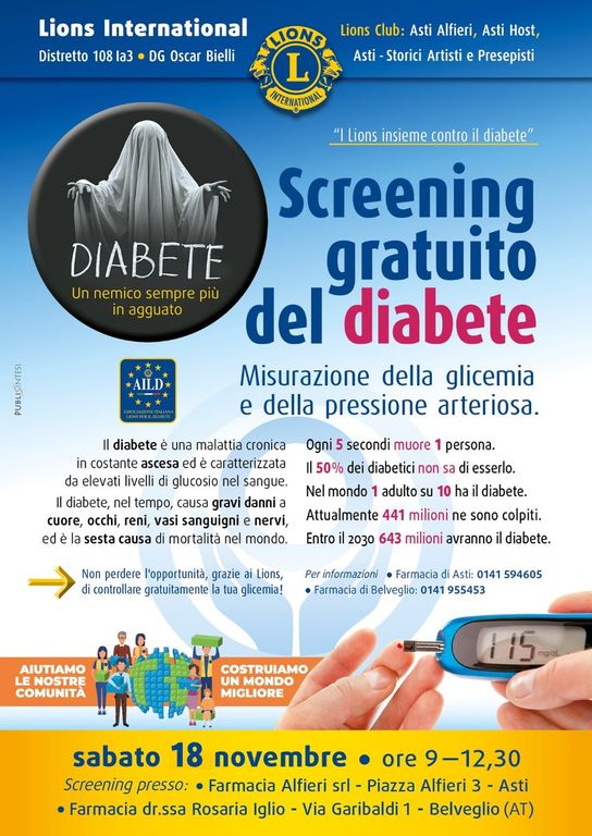 I tre Lions Club cittadini, Asti Alfieri, Asti Host, Asti Storici Artisti e presepisti, in collaborazione con AILD (Centro internazionale Lions ricerca sul diabete) e con il supporto del distretto Lions 108Ia3, stanno organizzando un’attività di screening sulla popolazione adulta asintomatica che potrebbe sviluppare nel tempo la malattia diabetica.