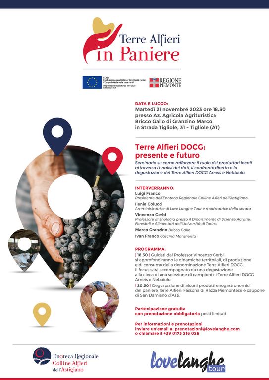 Il seminario "Terre Alfieri DOCG: presente e futuro" è in programma il 21 novembre alle 18:30 presso l’Azienda Agricola Agrituristica Bricco Gallo a Tigliole, Asti. Questo incontro, inserito nell’ambito del progetto di valorizzazione della filiera corta denominato "Terre Alfieri in Paniere" (TAP), mira a promuovere, oltre al rinomato vino "Terre Alfieri", una vasta gamma di prodotti tipici provenienti dalle aziende agricole astigiane, come ortofrutta, carni, salumi, formaggi, farine e miele.