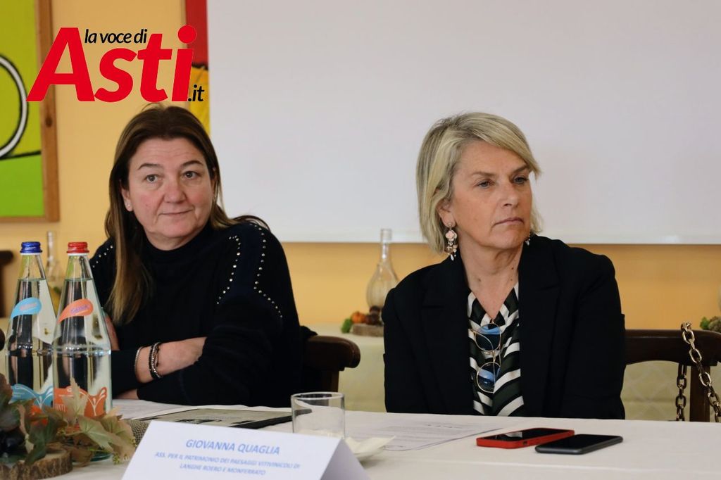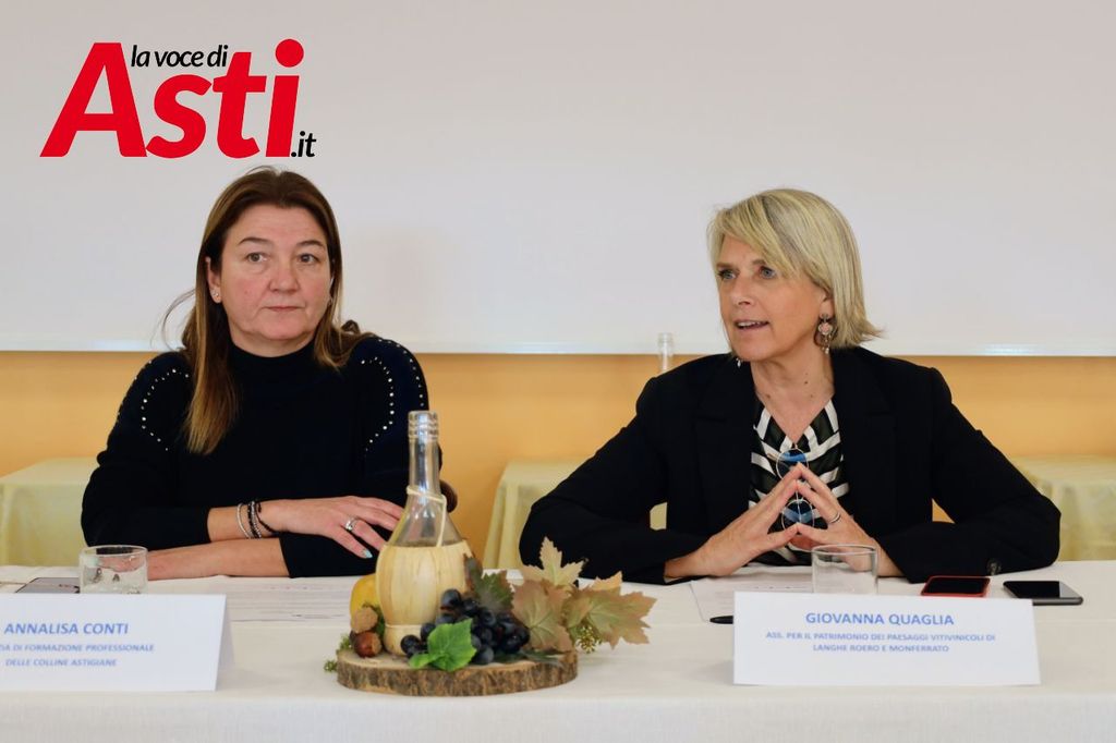 La presidente della Scuola Alberghiera Afp Colline Astigiane di Agliano Terme e Asti Annalisa Conti e la presidente dell’Associazione per il Patrimonio dei Paesaggi Vitivinicoli di Langhe Roero e Monferrato, Giovanna Quaglia, con la direttrice della scuola Alessandra Sozio, questa mattina, nella sede della scuola, hanno raccontato la genesi del progetto.