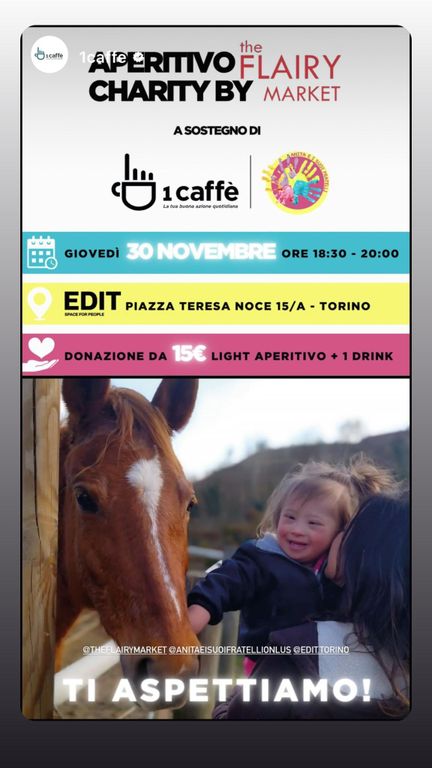 Nei giorni di Flairy Market, Anita sarà con gli amici di 1 Caffè Onlus, la prima realtà sociale digitale creata da Luca Argentero, Beniamino Savio, Pietro Mazza Midana e Silvia Meacci, per sostenere proprio le piccole-medie associazioni no profit italiane attraverso la diffusione della cultura del gesto del dono.