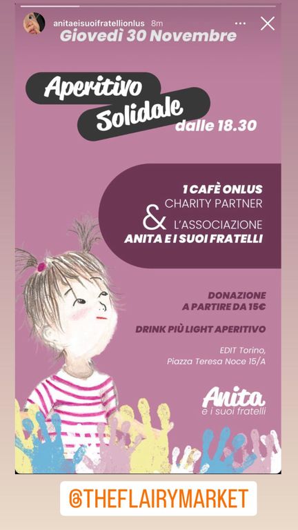 Dal 30 novembre al 2 dicembre anche la onlus astigiana Anita e i suoi fratelli parteciperà al Flairy market, evento di lifestyle torinese, al Garden di Edit, piazza Teresa Noce 15A.