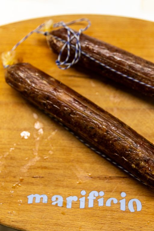 C'è anche la mortadella firmata “Marificio”, una creazione che ha richiesto più di un anno e mezzo di lavoro. Viene prodotta partendo dalle parti più grasse di tonno, pesce spada, totano e morone. Ogni prodotto, una volta assemblato, viene cotto a bassa temperatura nel cosiddetto “pesciugatore”, una sorta di essiccatore che, però, vuole riprodurre l'effetto 'cantina'. Nessun salume del Marificio contiene parti animali.