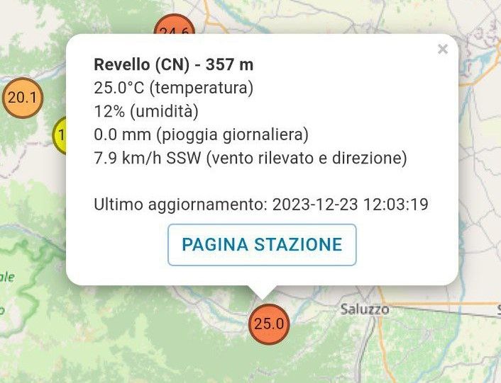Ancora più sorprendente il dato registrato intorno a mezzogiorno a Rodello (CN), ovvero +25,0°C. Valori record per dicembre anche sulla pedemontana cuneese.