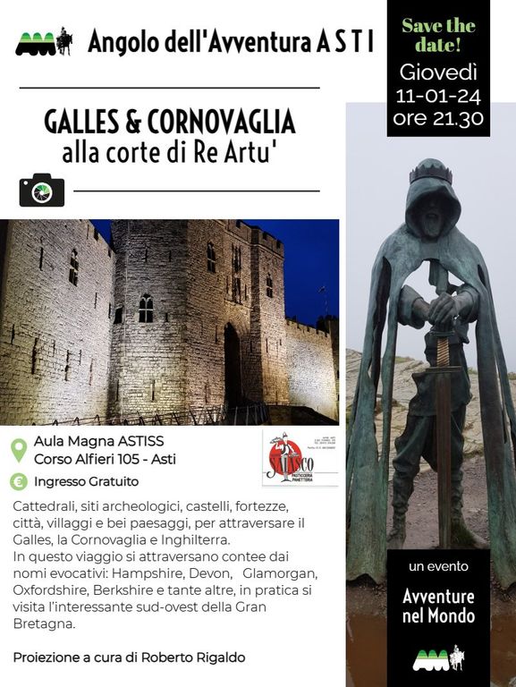 Giovedì 11 gennaio, alle ore 21.30, nell’Aula Magna dell’Astiss - Piazzale De Andrè (ex caserma), si terrà la proiezione del viaggio tra Galles e Cornovaglia, realizzato da Roberto Rigaldo nell’estate scorsa. L’appuntamento rientra nell’ambito delle proiezioni di viaggi organizzate dalla sezione astigiana dell’Angolo dell'avventura.