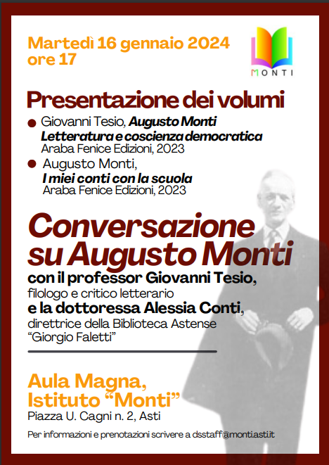 Un evento culturale di grande rilievo si terrà martedì 16 gennaio alle ore 17 presso l’aula magna dell’Istituto “A. Monti” di Asti, in piazza Cagni 2. Si tratta della presentazione della nuova edizione del libro "I miei conti con la scuola" (Araba Fenice Edizioni, 2023), che contiene una selezione di scritti pedagogici del professor Augusto Monti, illustre intellettuale, docente e scrittore astigiano.