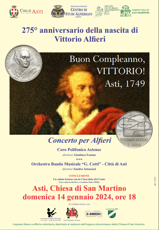 Per commemorare il 275° anniversario della nascita di Vittorio Alfieri, grande poeta e drammaturgo astigiano, la Fondazione Centro di Studi Alfieriani e il Gruppo Culturale San Marino Asti-ODV hanno organizzato un evento musicale di alto livello.