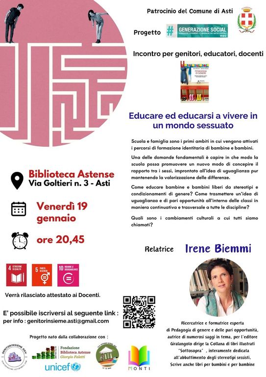 Venerdì 19 gennaio alle 20.45 alla Biblioteca Astense Giorgio Faletti si terrà l’incontro con la dottoressa Irene Biemmi dal titolo “Educare ed educarsi a vivere in un mondo sessuato”, rivolto a famiglie, educatori ed insegnanti, organizzato in collaborazione con il Nodo Antidiscriminazioni e l'Associazione Genitorinsieme all’interno del progetto #generazionesocial, con il patrocinio del Comune di Asti.