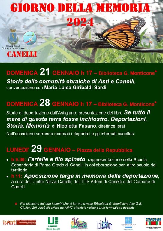 Il programma del Giorno della Memoria 2024 è coordinato dall’associazione Memoria Viva e realizzato in collaborazione con il Comune di Canelli, la Biblioteca G. Monticone, l’ISRAT, Unitre Nizza-Canelli, ANPI Canelli, Associazione Italiana Maestri Cattolici, la Scuola Secondaria di primo grado di Canelli, l'ITIS Artom di Canelli e altre scuole del territorio.