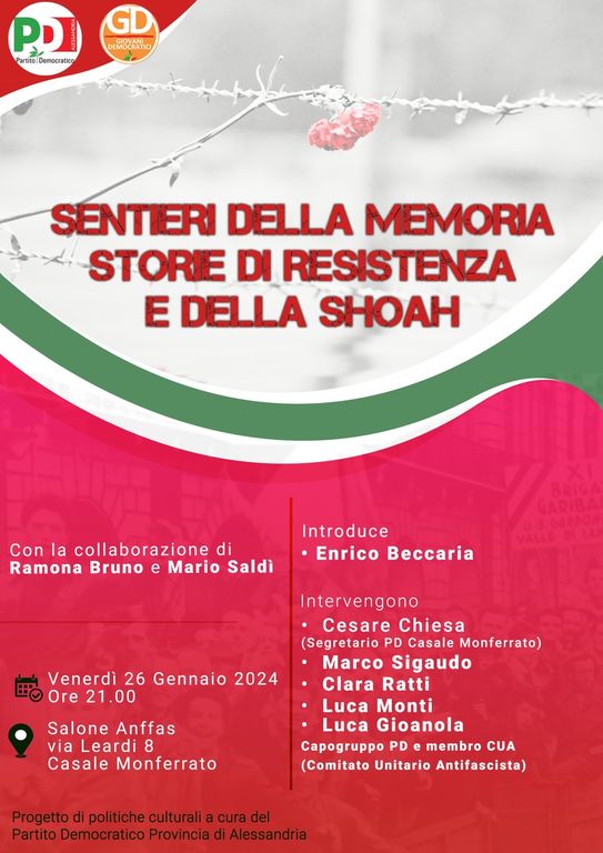 Con Enrico Beccaria, responsabile cultura e formazione alla segreteria provinciale del Partito Democratico, parleranno tre studiosi e storici locali Clara Ratti, Marco Sigaudo e Luca Monti che dalle loro prospettive storico-antropologiche, culturali, ci porteranno attraverso una narrazione vivace nei valori della resistenza per riportare in luce quello che è stato l’atto di coraggio, l’eroismo dei semplici. Con le letture e musiche di Ramona Bruno e Mario Saldì saranno proprio le parole dei sopravvissuti (Liliana Segre, Elie Wiesel, Nedo Fiano tra gli altri) a farsi voce della Storia.