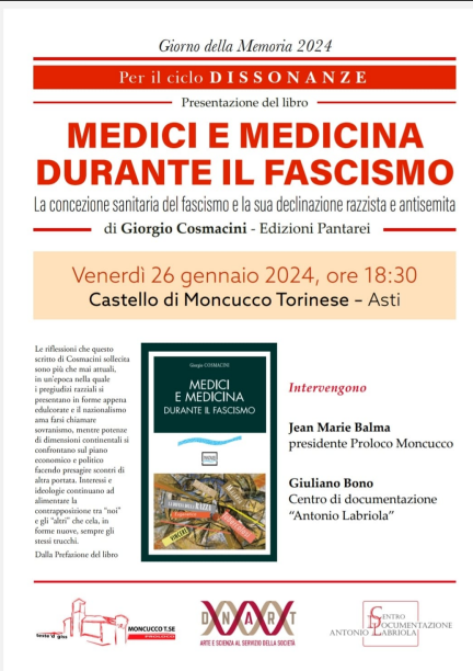 Nel ciclo di conferenze DISSONANZE, organizzato dalla Pro Loco di Moncucco Torinese, domani pomeriggio (venerdì 26) alle 18.30 si parlerà di medicina e fascismo. Il tema sarà affrontato dallo storico della medicina Giorgio Cosmacini, autore del libro “Medici e medicina durante il fascismo”, edito da Laterza.