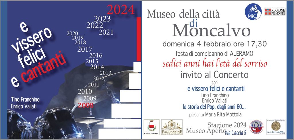 Per celebrare il suo compleanno, A.L.E.R.A.MO. Onlus ha organizzato un concerto dal titolo “…e vissero felici e cantanti”, che ripercorrerà la storia del pop, a partire dagli anni '60. Sul palco si esibiranno Tino Franchino ed Enrico Vailati, due musicisti che sapranno coinvolgere il pubblico con le loro interpretazioni di brani celebri e indimenticabili. A presentare l’evento ci sarà la presidente di A.L.E.R.A.MO. Onlus Maria Rita Mottola, che illustrerà anche le prossime attività dell’associazione.
