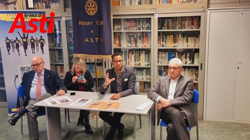 A fare gli onori di casa, il dirigente dell'Artom Franco Calcagno, Maurizio Mela, presidente del Rotary e la professoressa Chiara Cerrato.
