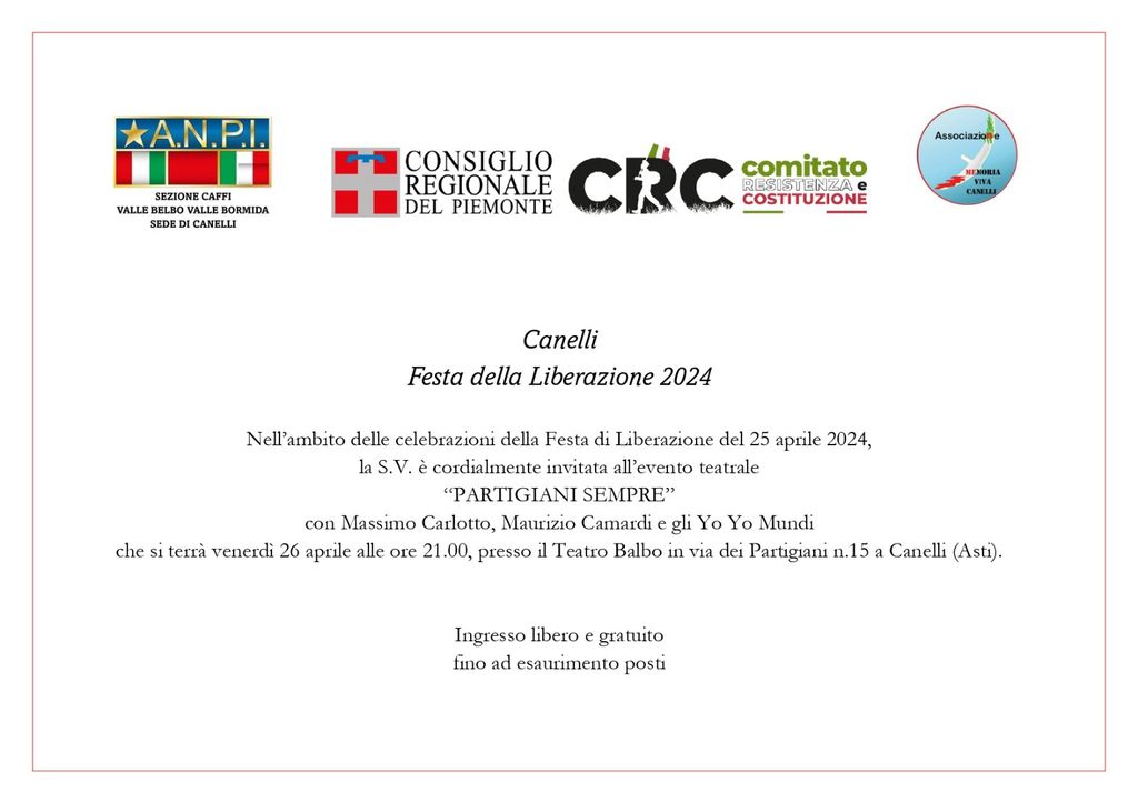 In occasione del 79° anniversario della Liberazione dal nazifascismo, l’associazione Memoria Viva e la sezione Anpi di Canelli organizzano un fitto programma di eventi celebrativi, col sostegno del Comitato Resistenza e Costituzione e del Consiglio Regionale del Piemonte e in collaborazione col Comune di Canelli.