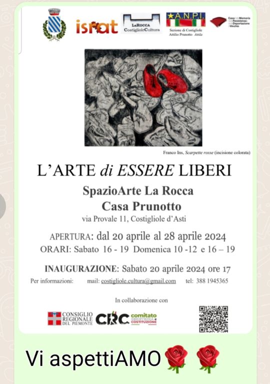 In particolare, sabato 20 aprile, alle ore 17 presso lo Spazio Arte La Rocca-Casa Prunotto di Costigliole d'Asti, verrà inaugurata la mostra L'Arte di Essere Liberi. Una trentina di artisti, alcuni dei quali under 35, con le loro opere, hanno rappresentato la Resistenza: una lettura, tra colori e visioni, di una scelta fatta dai giovani di allora per essere ri-conosciuta e nuovamente condivisa oggi, in un dialogo continuamente rinnovato tra generazioni diverse.