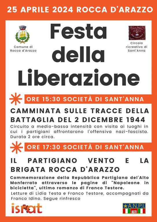 Come ogni anno, I'Israt (Istituto per la Storia della Resistenza e della Società Contemporanea in provincia di Asti) sarà impegnato in molteplici iniziative - realizzate in collaborazione con Comuni, associazioni ed enti del territorio astigiano - per celebrare il 79^ anniversario della Liberazione.