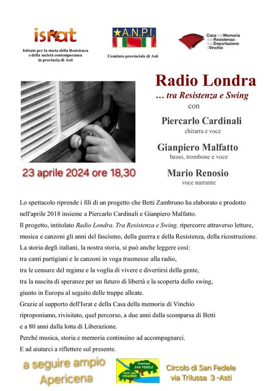 Il 23 aprile, alle ore 18,30 al circolo di San Fedele di Asti, i musicisti Piercarlo Cardinali e Gianpiero Malfatto, insieme alla voce narrante di Mario Renosio, con lo spettacolo Radio Londra, accompagneranno il pubblico, attraverso le canzonette e le musiche dello swing americano, alla ricerca di spazi di serenità e di divertimento nella tragica quotidianità della seconda guerra mondiale. Lo stesso spettacolo verrà replicato il 1^ maggio, alle ore 17 presso la sede dell'Auser di Asti.