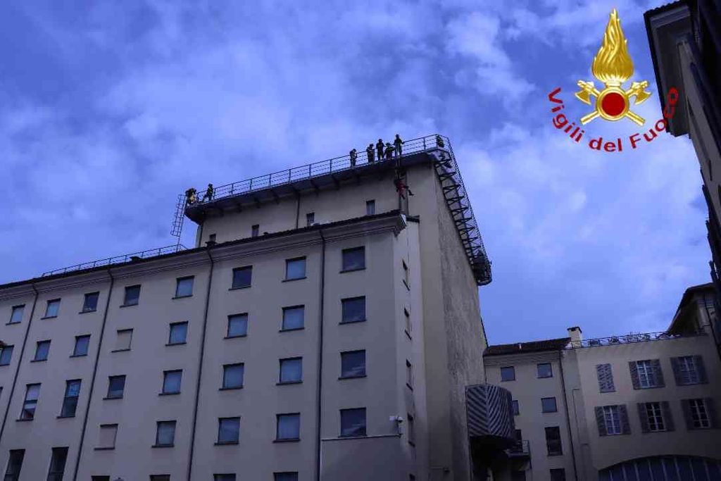 Impegnati venti operatori SAF (Nucleo speleo alpino fluviale) che hanno predisposto l'evacuazione di un pericolante attraverso l'allestimento di una teleferica con l'arrivo nella sottostante piazza Italia.