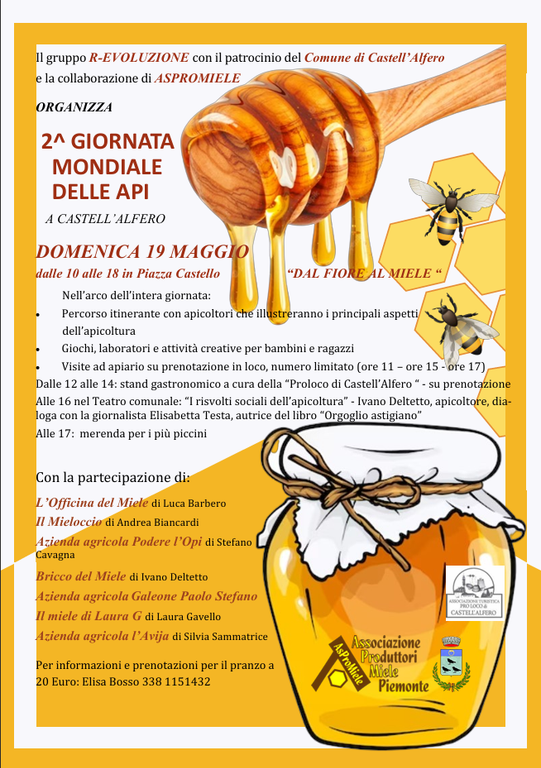 Il gruppo R-Evoluzione, in collaborazione con il Comune di Castell’Alfero, la Pro Loco e Aspromiele, organizza la seconda edizione della Giornata Mondiale delle Api. Evento dedicato all’importanza delle api nell’ecosistema, in programma domenica 19 maggio in piazza Castello.