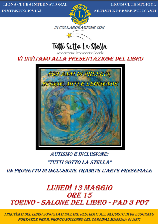 Il Lions club Storici, Artisti e Presepisti d'Asti, lunedì 13 maggio sarà al Salone del libro di Torino, Padiglione 3 P07, per presentare il libro  "800 anni di presepi, storie, miti e leggende" di Mauro Imbrenda.