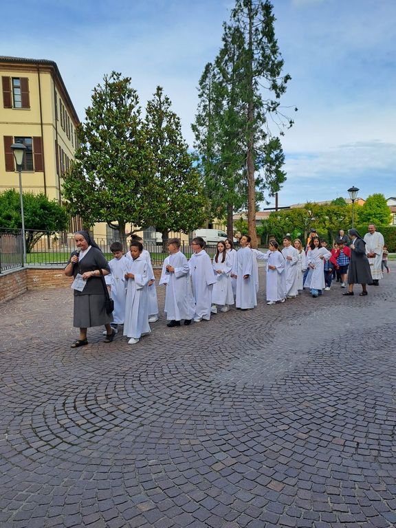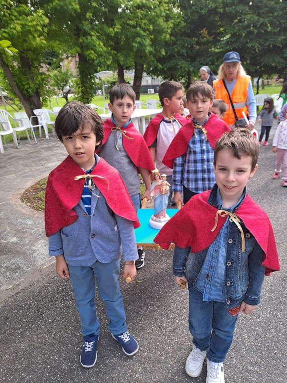 Organizzata da suor Lucia Bugnano, la coordinatrice Elena Pantani e il corpo docente, la celebrazione ha visto i bambini arrivare con un fiore in mano da deporre ai piedi della statua della Madonna, pronta per la processione serale. Don Giacinto Ramian ha presieduto la cerimonia.