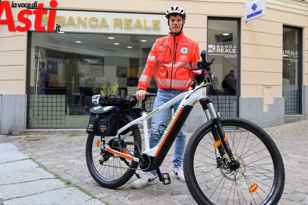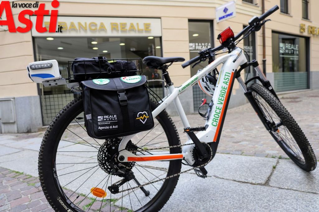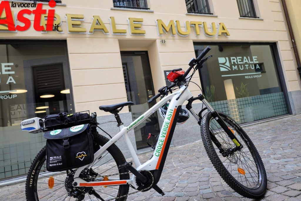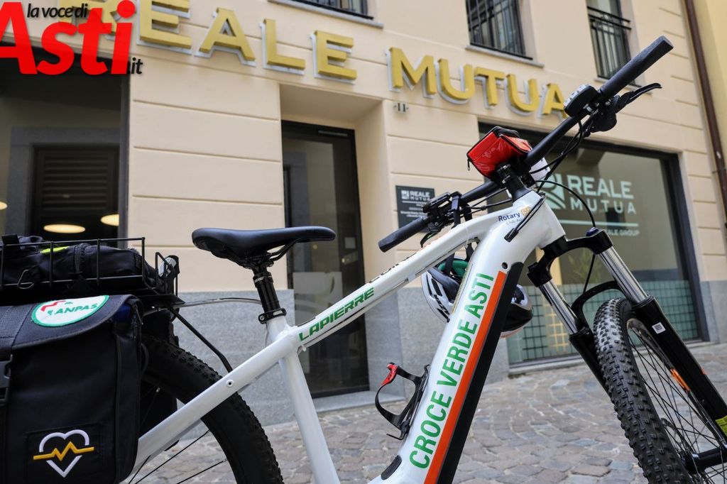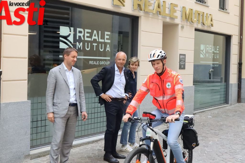 Questa mattina è stata ufficialmente presentata la nuova e-bike attrezzata per il soccorso che l'agenzia Reale Mutua Assicurazioni di Asti (agenzia gestita dai soci Roberto Briccarello, Vittoria Briccarello e Gabriele Canalia) e il Rotary Club (rappresentato dal presidente Maurizio Mela) hanno congiuntamente acquistato, al costo di 3.500 euro, per donarla alla Croce Verde cittadina presente con un volontario e con la presidente Domenica Demetrio.