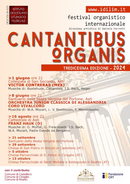 Con l’arrivo di giugno, ripartono le attività musicali dell’Istituto Diocesano Liturgico Musicale di Asti (IDILIM). Dopo l’inaugurazione con il recital d’organo del maestro messicano Victor Contreras nella splendida Collegiata di San Secondo, la rassegna "Cantantibus Organis" prosegue l'8 giugno alle ore 21 presso il Santuario della Beata Vergine del Portone in Asti.