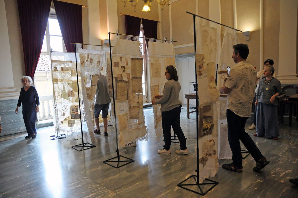 Stratificando lini antichi, perle, pizzi, trine e canape grezze, ricordi e battiti del cuore, ognuno ha dato vita alla propria “mattonella” di tessuto, che, durante la fase collettiva di domenica, è stata incorporata, grazie all’utilizzo di lenzuola, centrini e quant’altro, a delle tele più grandi. Il risultato è un’installazione artistica che accompagnerà il monologo: una sorta di grande galleria, quattro portali che consentiranno di entrare- fisicamente e non solo - nel mondo di Teresa.