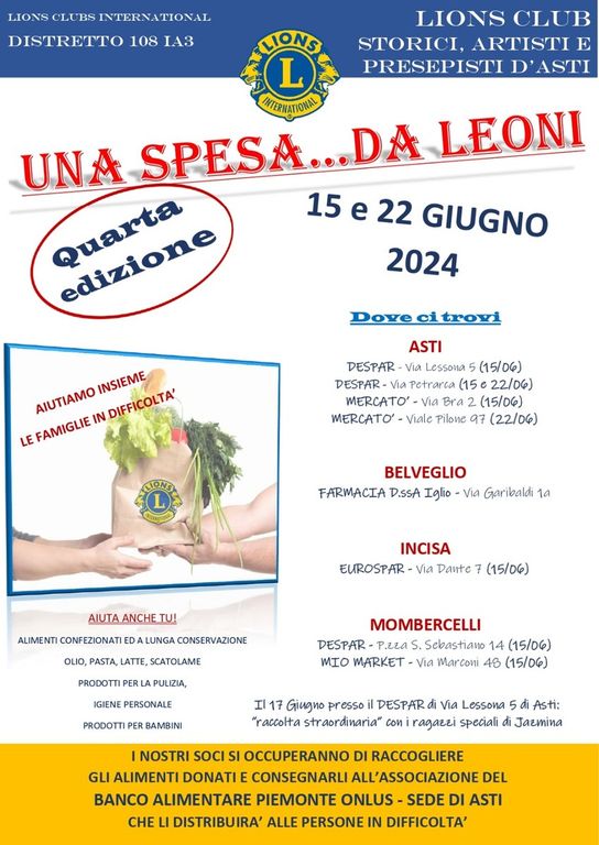 Per il quarto anno consecutivo, il Lions Club Storici Artisti e Presepisti d’Asti, sotto la guida di Donatella Peirone, ha dato il via all’iniziativa “Una spesa… da Leoni”. Un appuntamento ormai consolidato che si terrà sabato 15 e sabato 22 giugno, con l’obiettivo di raccogliere alimenti e beni di prima necessità per il Banco Alimentare di Quarto.