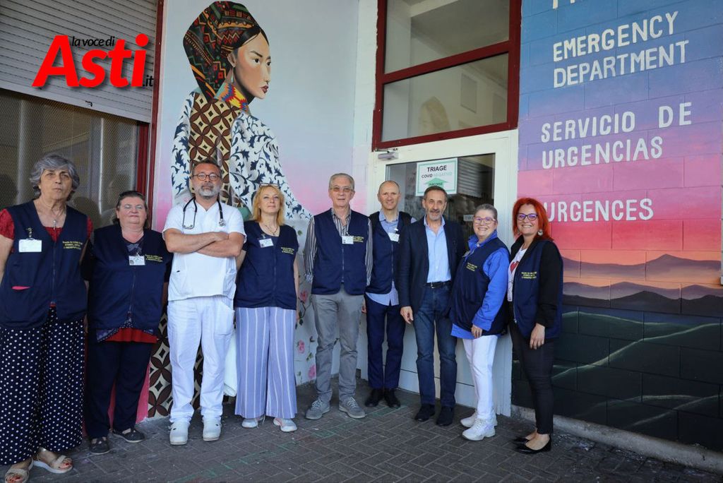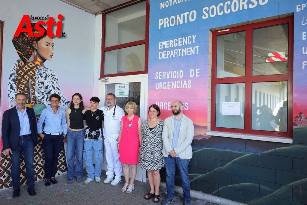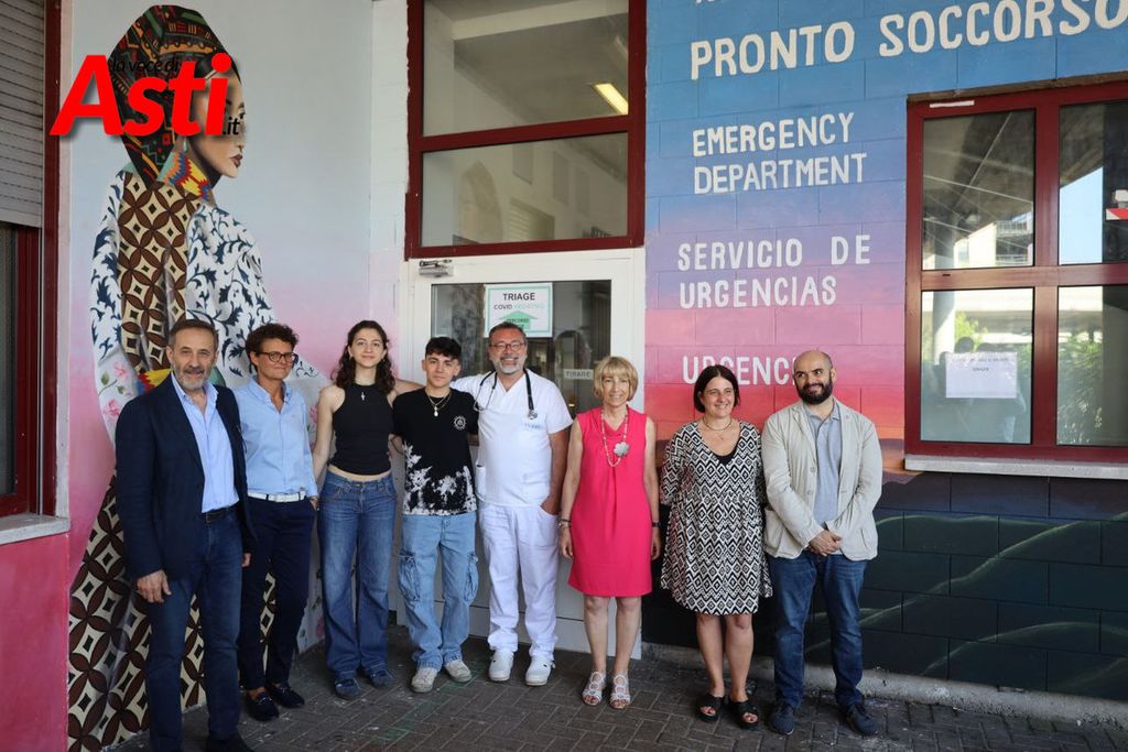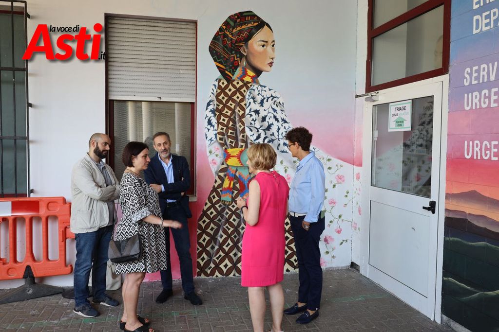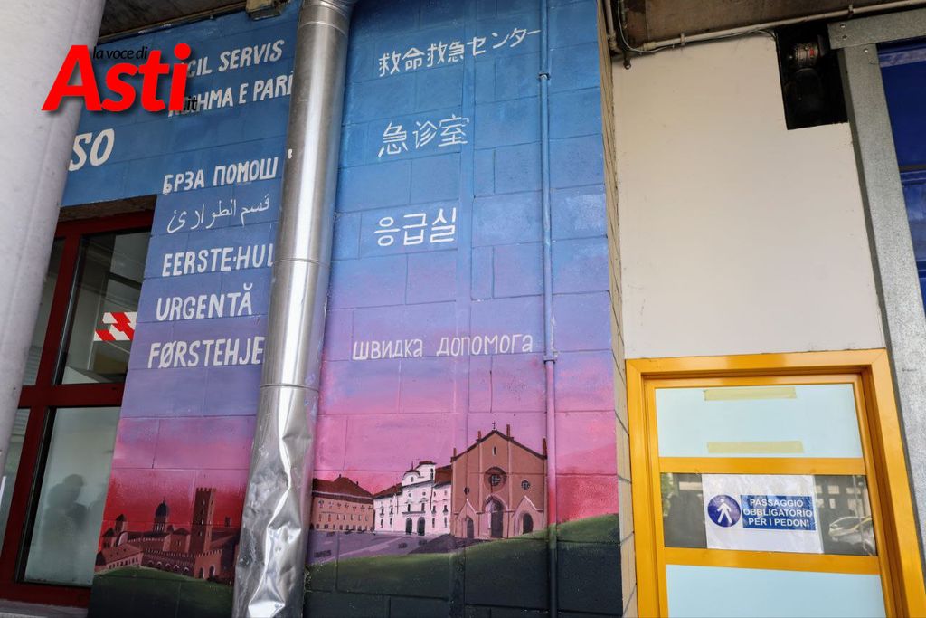 Una donna vestita con abiti tradizionali, la città di Asti con le sue torri e i suoi monumenti e la scritta Pronto Soccorso, declinata in sedici lingue, dal turco allo spagnolo, dal giapponese all'arabo. Questi tre elementi sono il fulcro del murales, inaugurato questa mattina, che ora campeggia all'ingresso del Pronto Soccorso dell'ospedale Cardinal Massaia di Asti.