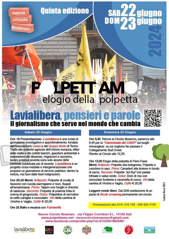 Il Nuovo Circolo Nosenzo (via Filippo Corridoni 58, Asti) Info 0141 215742) si appresta ad accogliere la quinta edizione di "¡Polpettiamo!", l'evento che celebra nel contempo la cucina popolare e il giornalismo d'inchiesta. Nelle giornate del 22 e 23 giugno, tra incontri, passeggiate, balli e degustazioni di polpette, la manifestazione offrirà un'occasione per riscoprire i sapori genuini della tradizione contadina e riflettere su temi di stringente attualità.