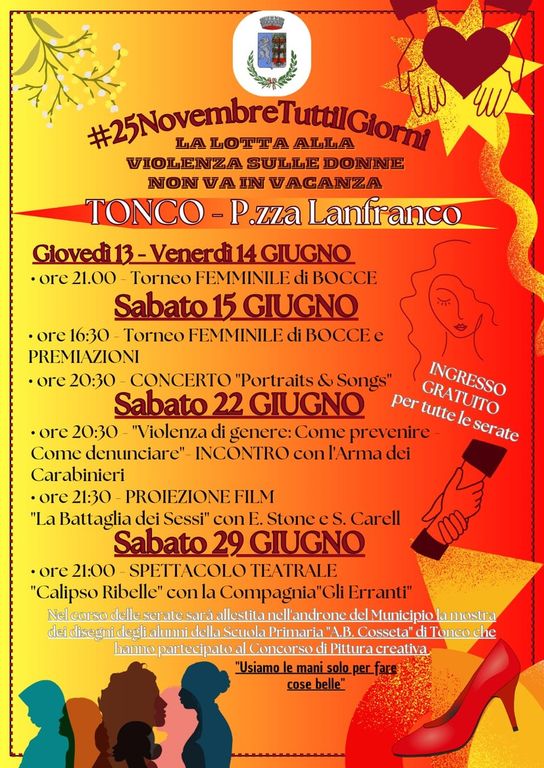 Nella centrale piazza Lanfranco, il Comune di Tonco ha dato il via alla rassegna “#25novembre tuttiigiorni - La lotta alla violenza sulle donne non va in vacanza”, un’iniziativa che unisce musica, arte e impegno sociale per combattere la violenza di genere. La serata inaugurale del 15 giugno è stata un tributo alle donne attraverso le canzoni d’autore più significative, interpretate dall’artista Gianni Alba e dal cantautore Nando Rizzo. Il sindaco Cesare Fratini ha aperto l’evento sottolineando la necessità di mantenere alta l’attenzione su questa terribile piaga sociale.