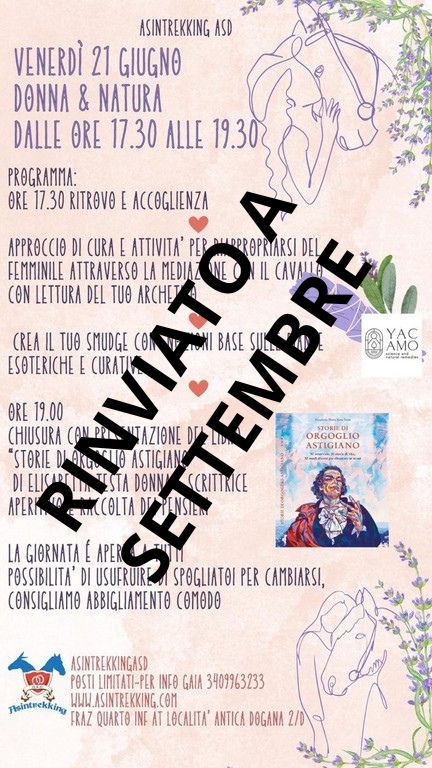 È rinviata a sabato 7 settembre la presentazione del libro "Storie di Orgoglio Astigiano" all'Asintrekking di Asti.