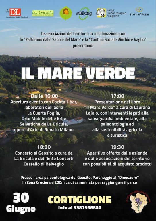 Il weekend prosegue a Cortiglione con "Il Mare Verde", organizzato dalle associazioni del territorio in collaborazione con "Lo zafferano dalle sabbie del mare" e la cantina "Vinchio Vaglio". L'evento, dedicato alla valorizzazione del territorio come bene da salvaguardare a livello ambientale, paesaggistico e culturale, si terrà domenica 30 giugno presso l’area paleontologica del geosito di Cortiglione.