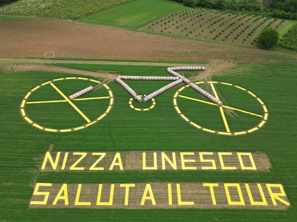 Il vice-sindaco Pier Paolo Verri si è occupato della scritta: "L'idea era di fare qualcosa di visibile. Abbiamo pensato di realizzare un'enorme bicicletta 60 metri x 40 e sotto la scritta 60x15 "Nizza Uesco saluta il Tour de France". Sabato scorso abbiamo cominciato a lavorarci, prima in ufficio con i disegni e la progettazione e poi direttamente sul campo. Lunedì avremo anche i ragazzi del centro diurno che animeranno la scritta, il tour de France dopotutto è la seconda manifestazione a cadenza annuale più seguita dopo il super bowl, un saluto e un benvenuto erano quindi d'obbligo".