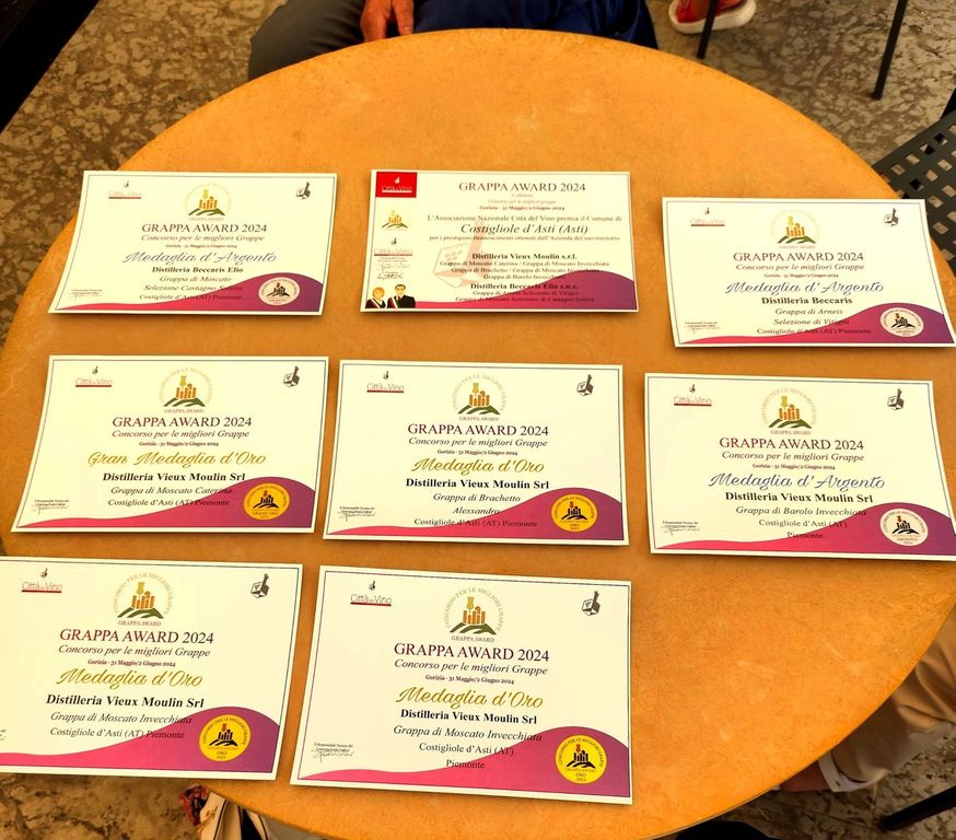 Gli importanti riconoscimenti sono stati ottenuti da diverse aziende locali: Distilleria Vieux Moulin, con sede a Motta di Costigliole, che si è aggiudicata la gran medaglia d’oro con la grappa moscato Caterina e altre medaglie d’oro con la grappa moscato invecchiata , grappa Brachetto e grappa di Barolo invecchiata . Alla distilleria Beccaris Elio di Boglietto di Costigliole sono state assegnate le medaglie d’argento per la grappa di Arneis Selezione di Vitigni e nella grappa di moscato selezione di Castagno Solera.