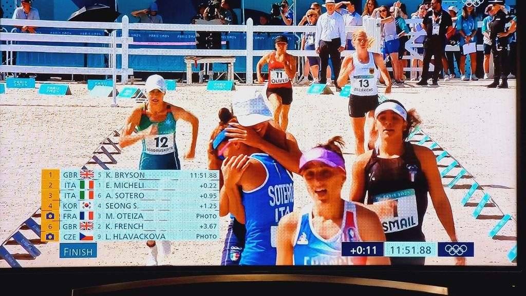 Con la Laser run, praticamente un terzetto in testa, con Micheli che parte insieme a French e Oteiza. Sotero parte con 10″ sulla decima, la prima che sarà esclusa. Elena Micheli 5/5, esce in solitaria dal primo poligono. Sempre sesta Alice Sotero, ai 900 metri Michela ha 5″ di vantaggio su Oteiza. Sesta Sotero a 27″ dalla connazionale. Ai 1500 terzetto in testa, Seong in rimonta. Ancora sesta Sotero a 25″, sono 15″ di vantaggio sulla decima. Dopo un terzo giro di assoluta spinta Micheli continua a forzare in corsa, passata Bryson. Ai 2100m Sotero è sesta a 18″ dalla testa.